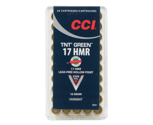CCI Varmint TNT Green delivers a reliable and consistent clean-firing load. Each box contains 50 rounds of 16 grain .17 HMR with hollow-point bullets and brass casings.